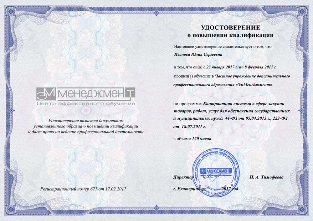 Выдается удостоверение. Программа разработана в соответствии с профстандартом "Специалист в сфере закупок"